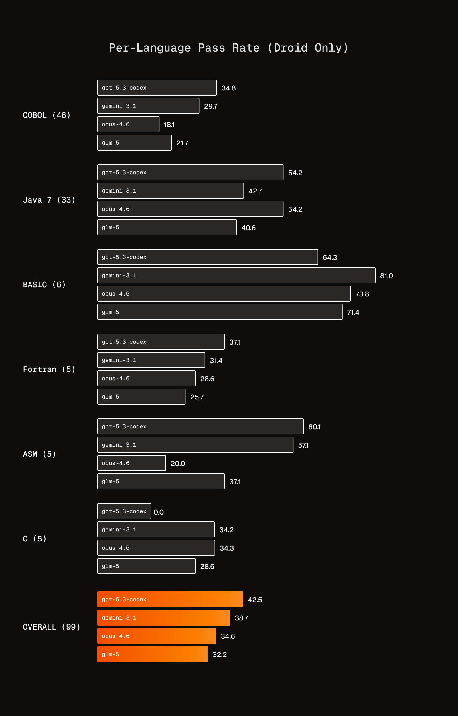 - GPT-5.3-Codex: leads overall (42.5%) and leads on COBOL (34.8%), but scores poorly on C.