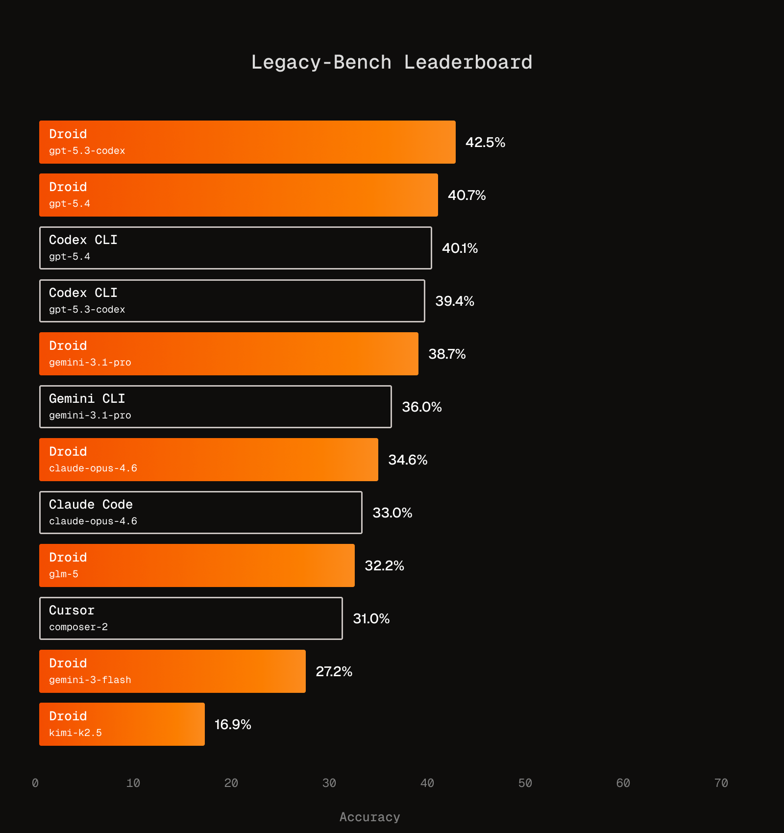 Legacy environments reward agents that verify their work systematically, iterate when things go wrong, and handle format-sensitive output precisely. On 3 tasks, Gemini CLI declared success without compiling and testing the code. Droid's scaffolding enforced a compile-run-verify loop that caught those errors before submission. Gemini CLI also lost at least 2 tasks to a heredoc parser bug that rejected valid bash syntax.