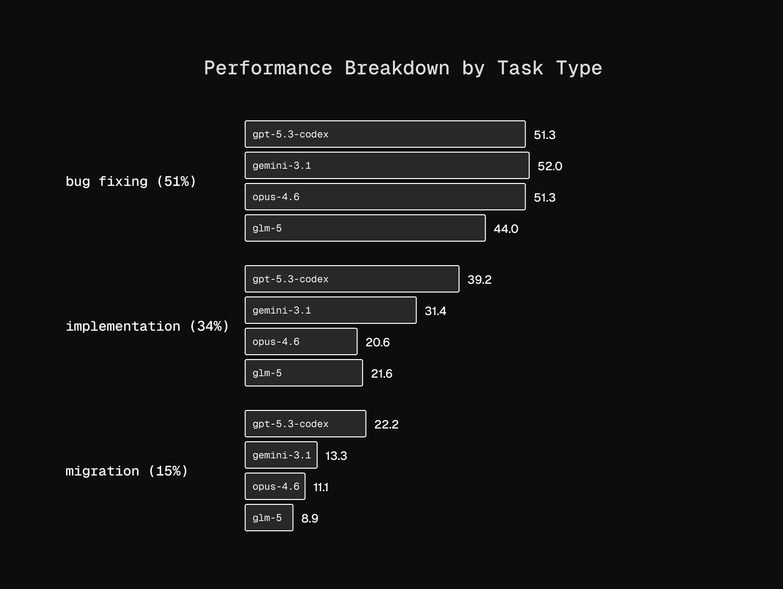 On bug fixing tasks, the top three models perform almost equally well, and model choice is a minor factor. As tasks get harder, model choice matters more: implementation and migration scores diverge sharply across models, with the gap widening at each step.
