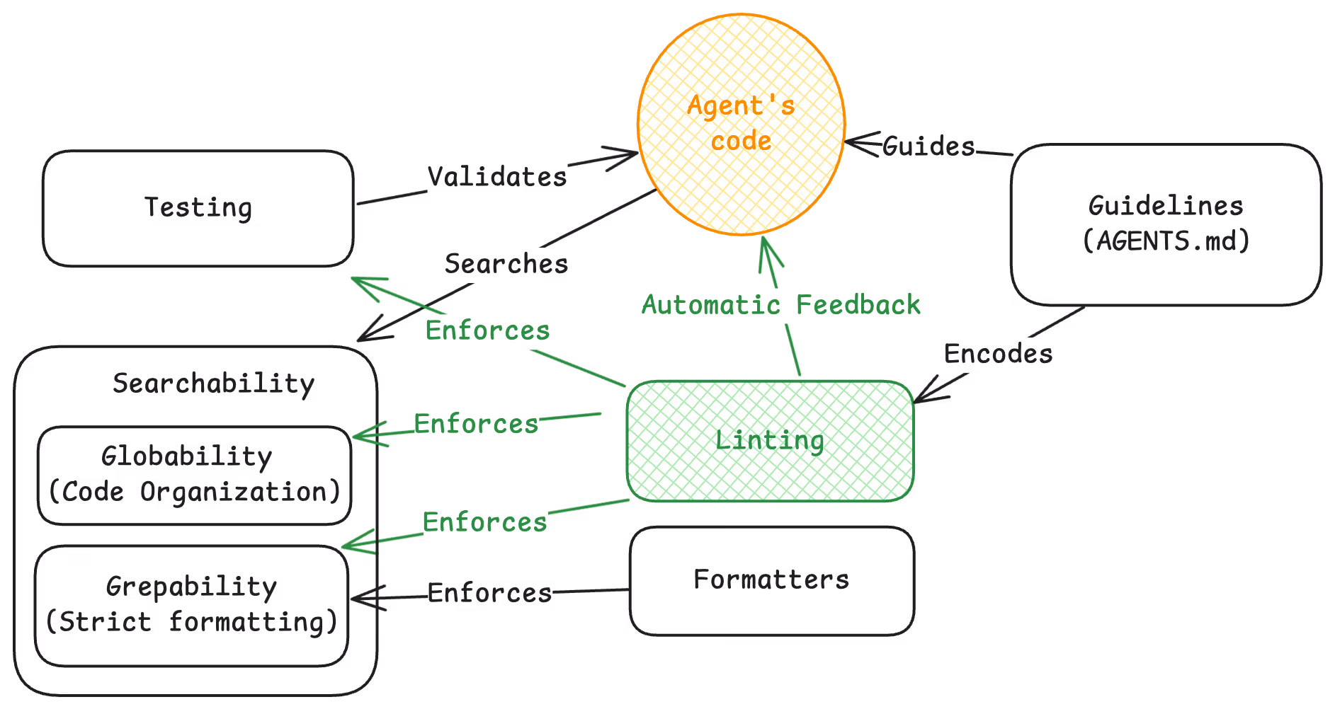 This results in agents that generate code, get automatic feedback from linters, and self‑learn/iterate until clean. Then “lint passing” becomes a proxy for “conforms to architecture and best practices.” Linting is the executable spec that ties human intent to agent output, ensuring consistent, navigable code at scale.